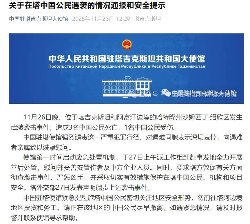 11月26日晚,位于塔吉克斯坦和阿富汗边境的哈特隆州沙姆西丁·绍欣区发生武装袭击事件,造成3名中国公民死亡,1名中国公民受伤。